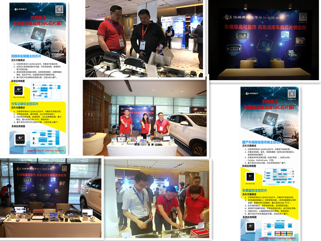 会场外展厅,开阳电子展示了自主研发的车载信息终端主控芯片和样机、wifi/4G/隐藏式行车记录仪主控芯片和样机、流媒体后视镜主控芯片和样机、4路监控主控芯片和样机、数字仪表主控芯片和样机等,引起了车企、方案商、Tier1厂、投资机构等的广泛关注。